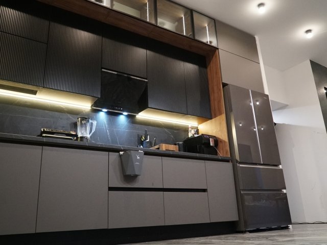 Особое внимание уделено освещению: подсветка рабочей зоны обеспечивает комфорт при приготовлении кулинарных шедевров, а подсветка верхних витрин приглашает насладиться приглушенным светом вечером.